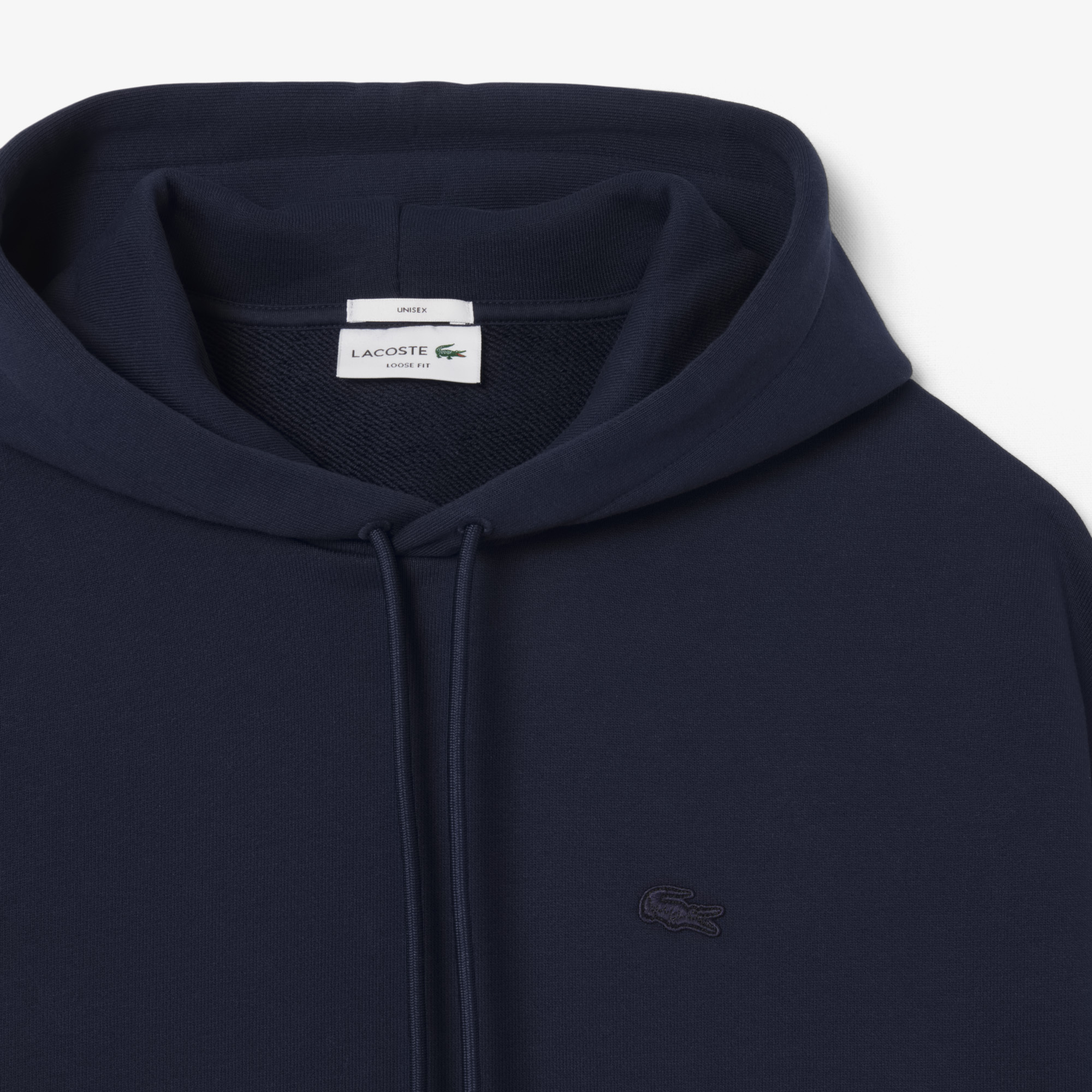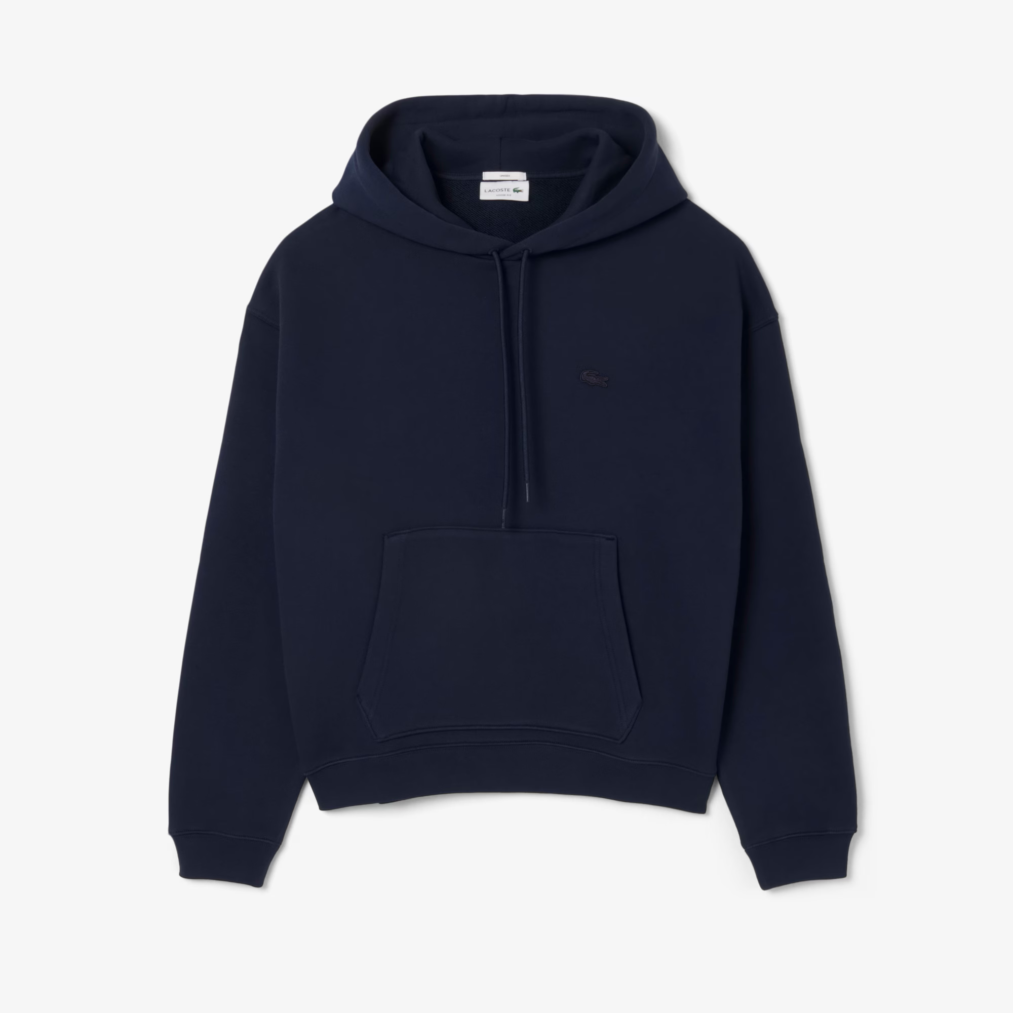 Questa felpa con cappuccio incarna la visione di eleganza rilassata di Lacoste. Realizzata in comodo cotone felpato pesante, con un taglio morbido e un design minimalista, rifinita con un caratteristico coccodrillo con sottili impunture. Un connubio tra moda e stile sportivo, con dettagli rifiniti a coste. This unisex product runs large, if you are a woman, choose 1 size smaller than your usual size. Tessuto pesante realizzato in cotone organico e cotone riciclato dai nostri scarti di produzione Loose fit, spalle scese Tasca a marsupio Vita e polsini elasticizzati a coste Cappuccio con cordoncini regolabili Coccodrillo ricamato tono su tono con impunture nere sul busto Supporto principale: Cotone (100%) / Bordo a coste: Cotone (98%), Elastan (2%)