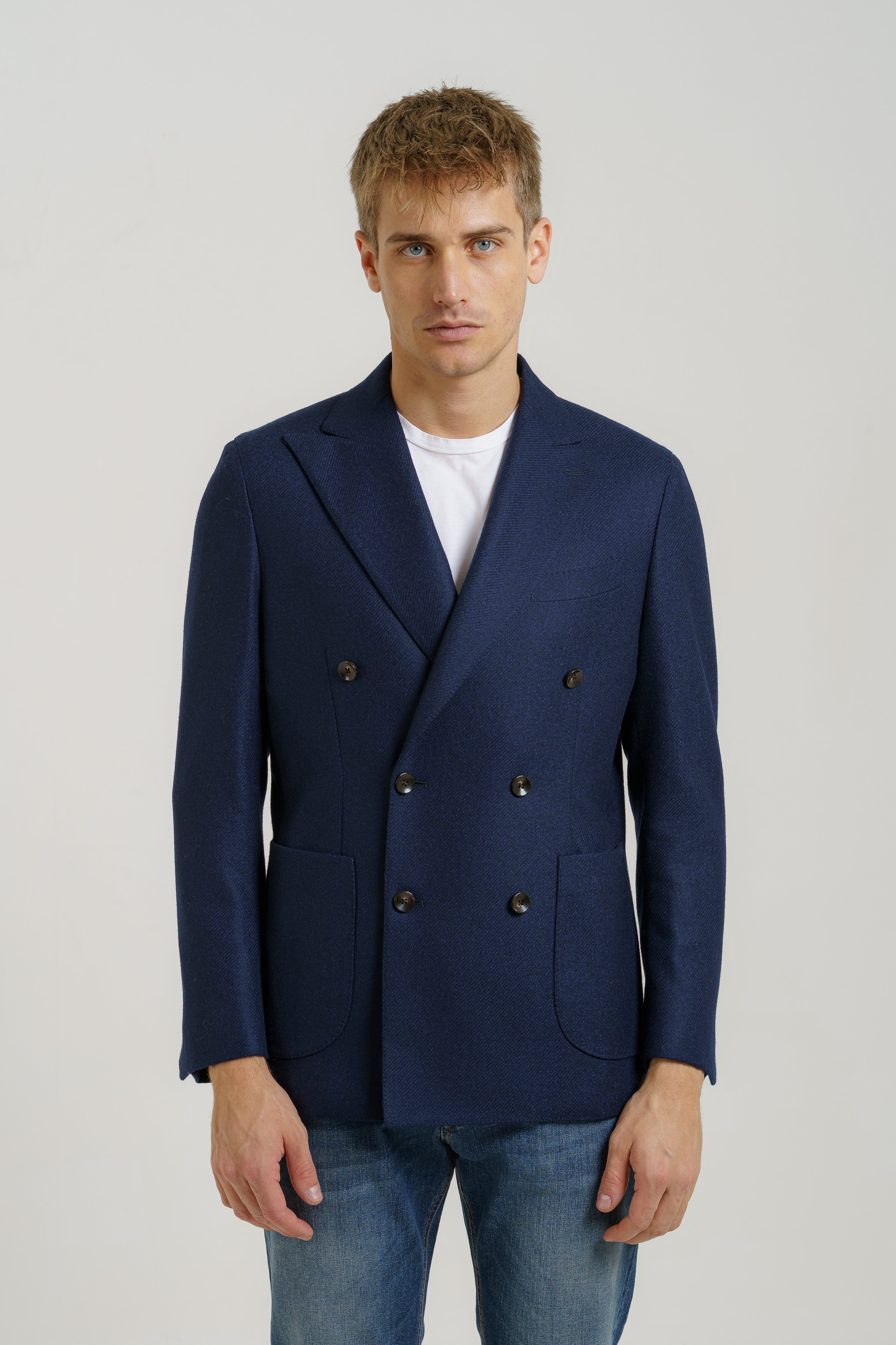 Il taglio doppiopetto, valorizzato da revers ampi, bottoni tono su tono e tasche applicate, crea una silhouette decisa ma raffinata, ideale per completare outfit casual chic o look più formali. La texture ricca e profonda del tessuto esalta la tonalità blu, rendendo il capo sofisticato e sempre attuale.