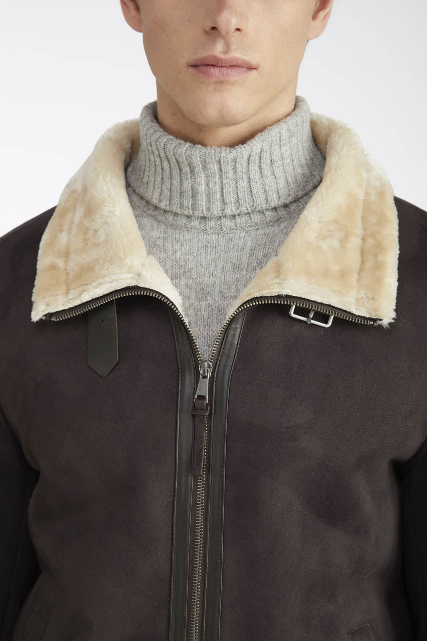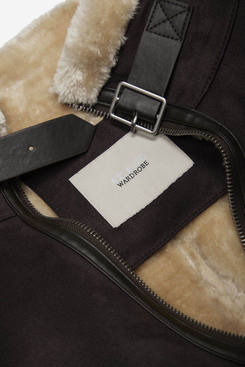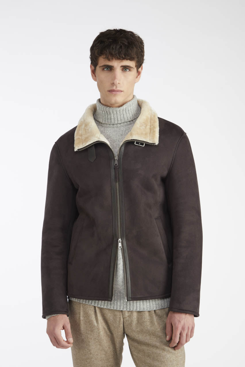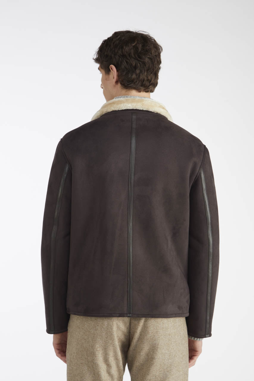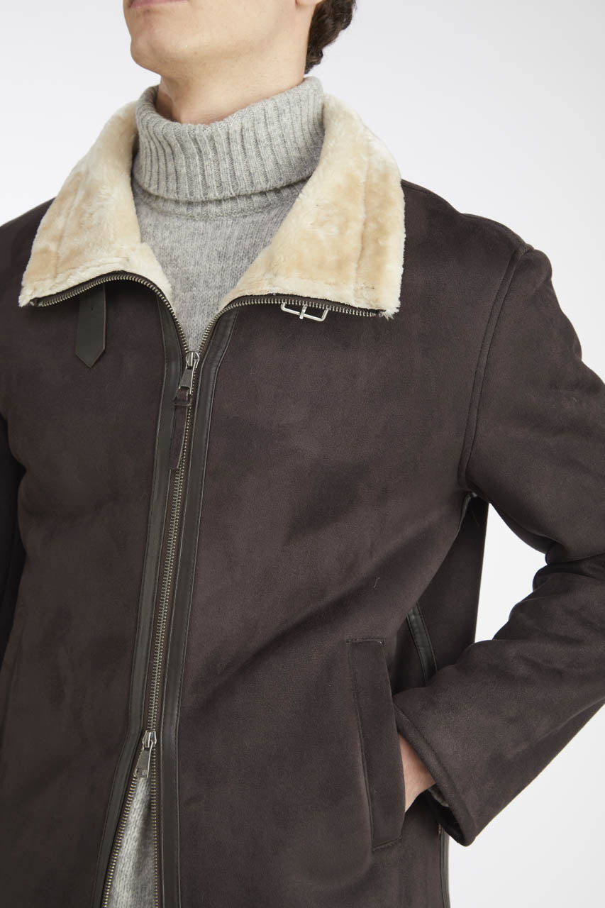 Giubbino in ecomontone dal look sofisticato e contemporaneo. La finitura effetto suede all’esterno incontra un interno caldo e avvolgente in ecopelliccia beige a contrasto, visibile anche nel colletto a camicia. La chiusura frontale con zip a doppio cursore garantisce praticità e comfort, mentre le tasche a filetto sui fianchi aggiungono funzionalità al design essenziale.