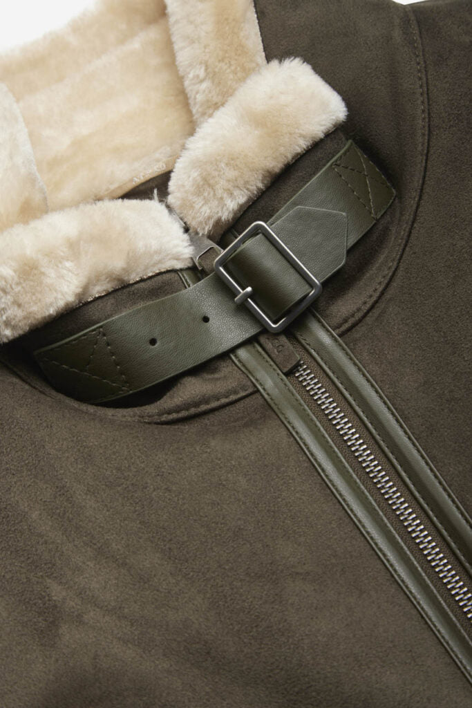 Giubbino in ecomontone dal look sofisticato e contemporaneo. La finitura effetto suede all’esterno incontra un interno caldo e avvolgente in ecopelliccia beige a contrasto, visibile anche nel colletto a camicia. La chiusura frontale con zip a doppio cursore garantisce praticità e comfort, mentre le tasche a filetto sui fianchi aggiungono funzionalità al design essenziale.