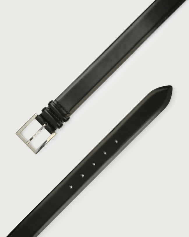 Realizzata in vitello opaco bombato con fibbia lucida in nichel e doppio passante, è una scelta raffinata per l'abbigliamento professionale e le grandi occasioni.