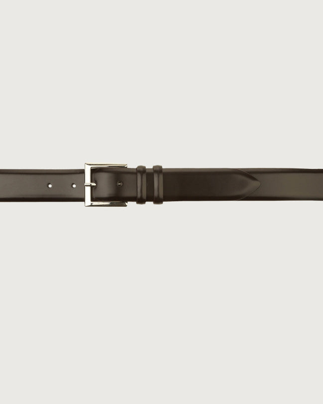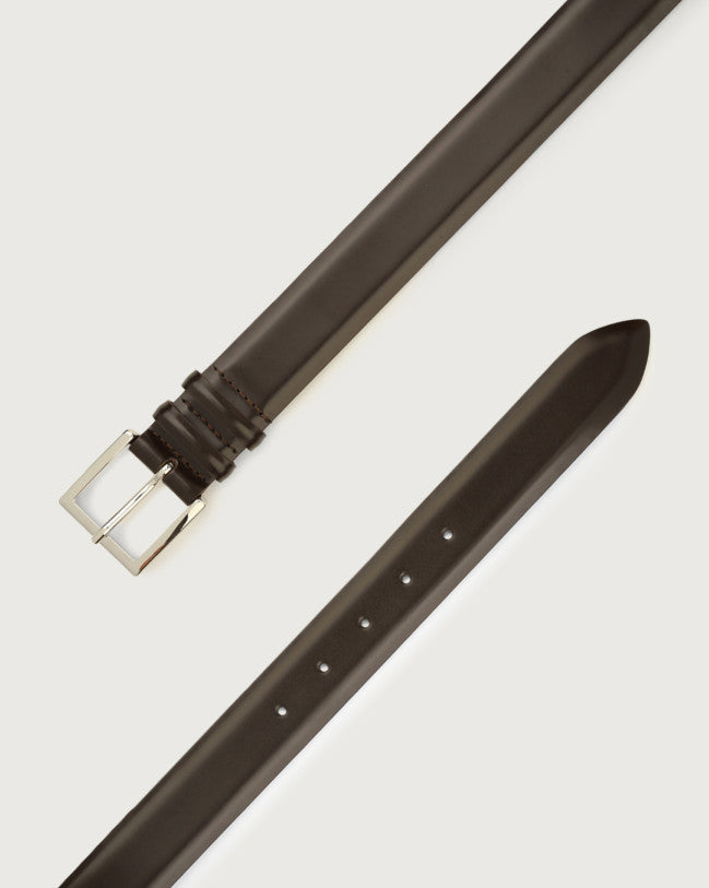 Realizzata in vitello opaco bombato con fibbia lucida in nichel e doppio passante, è una scelta raffinata per l'abbigliamento professionale e le grandi occasioni.