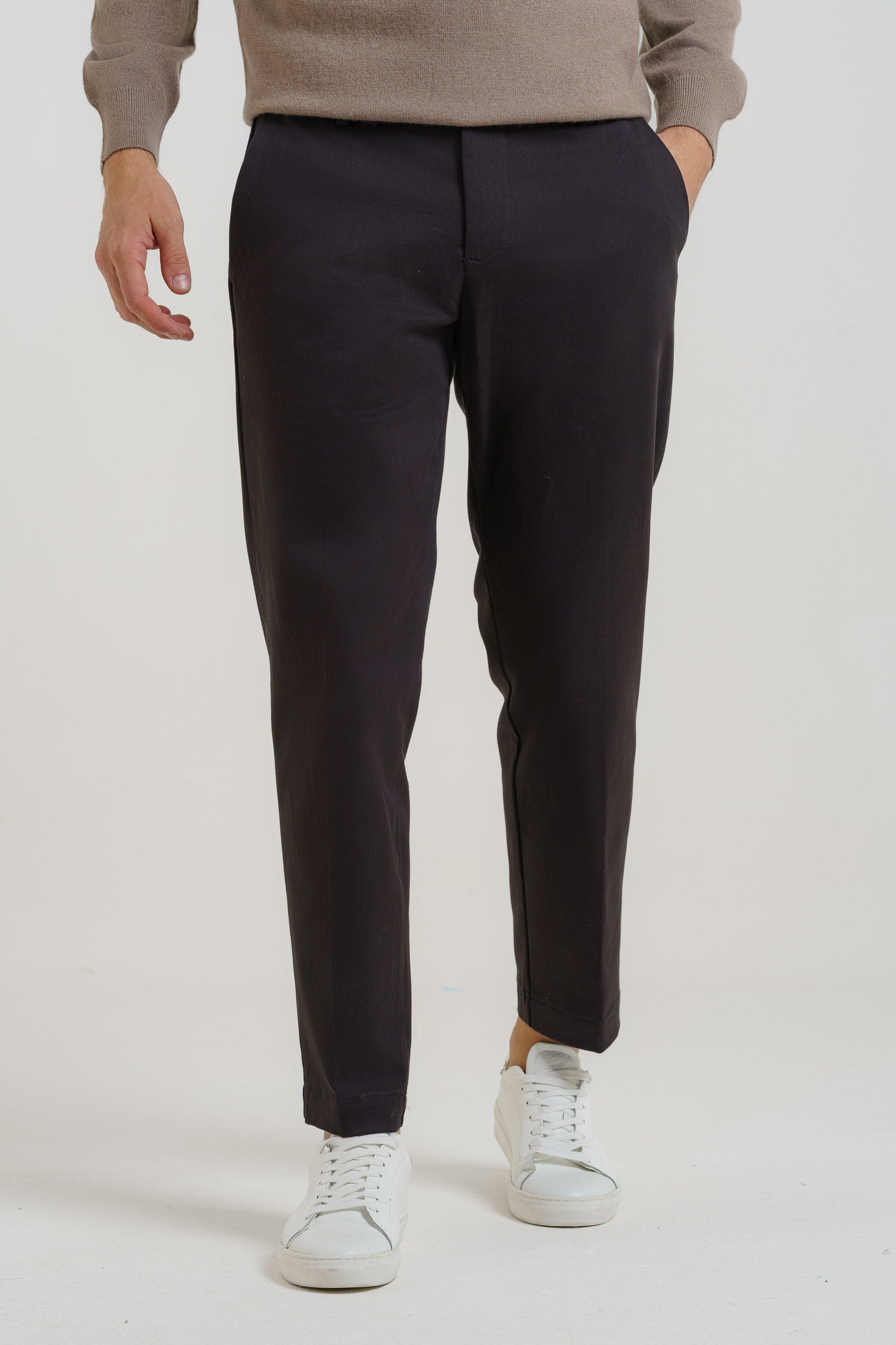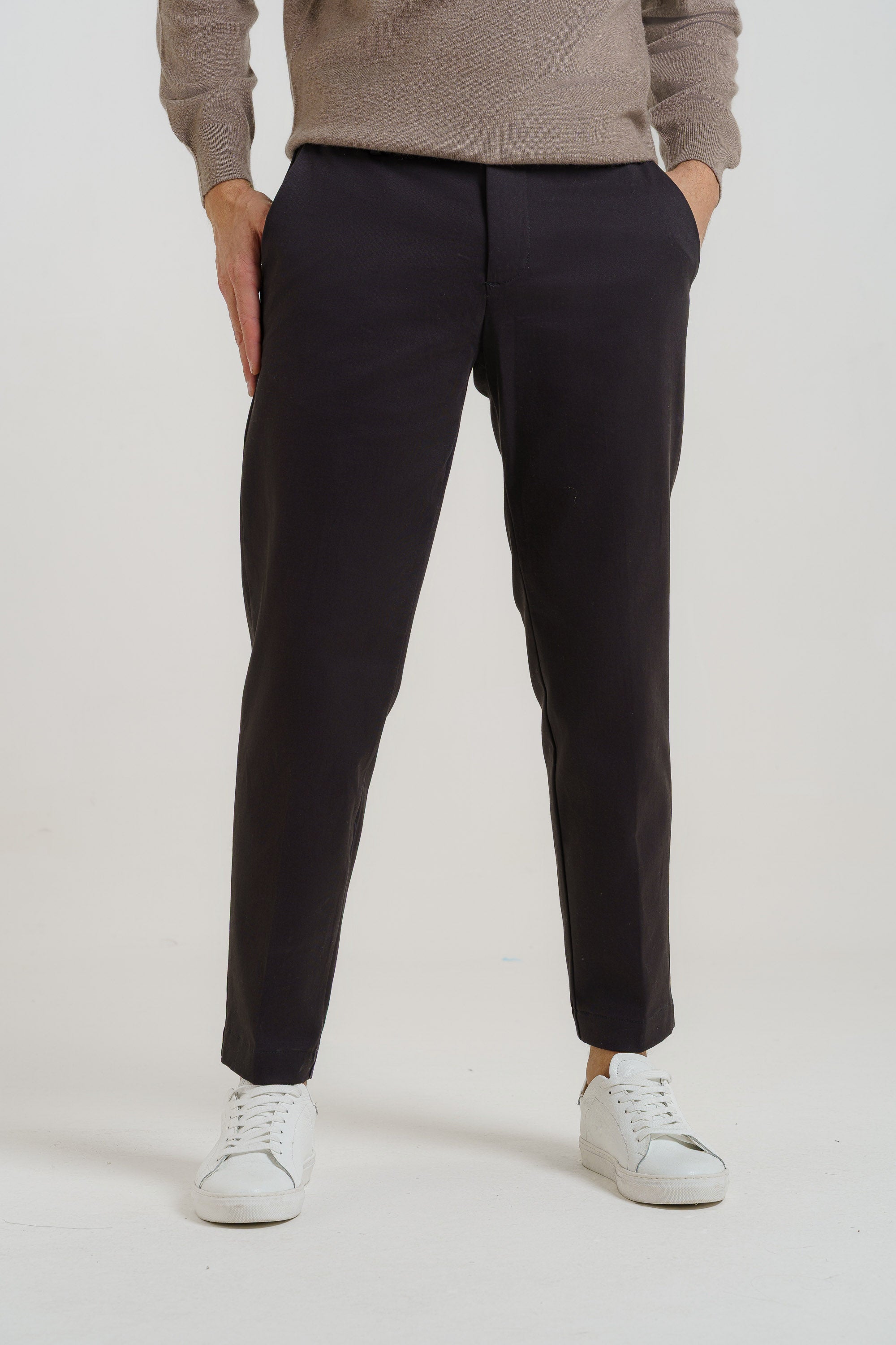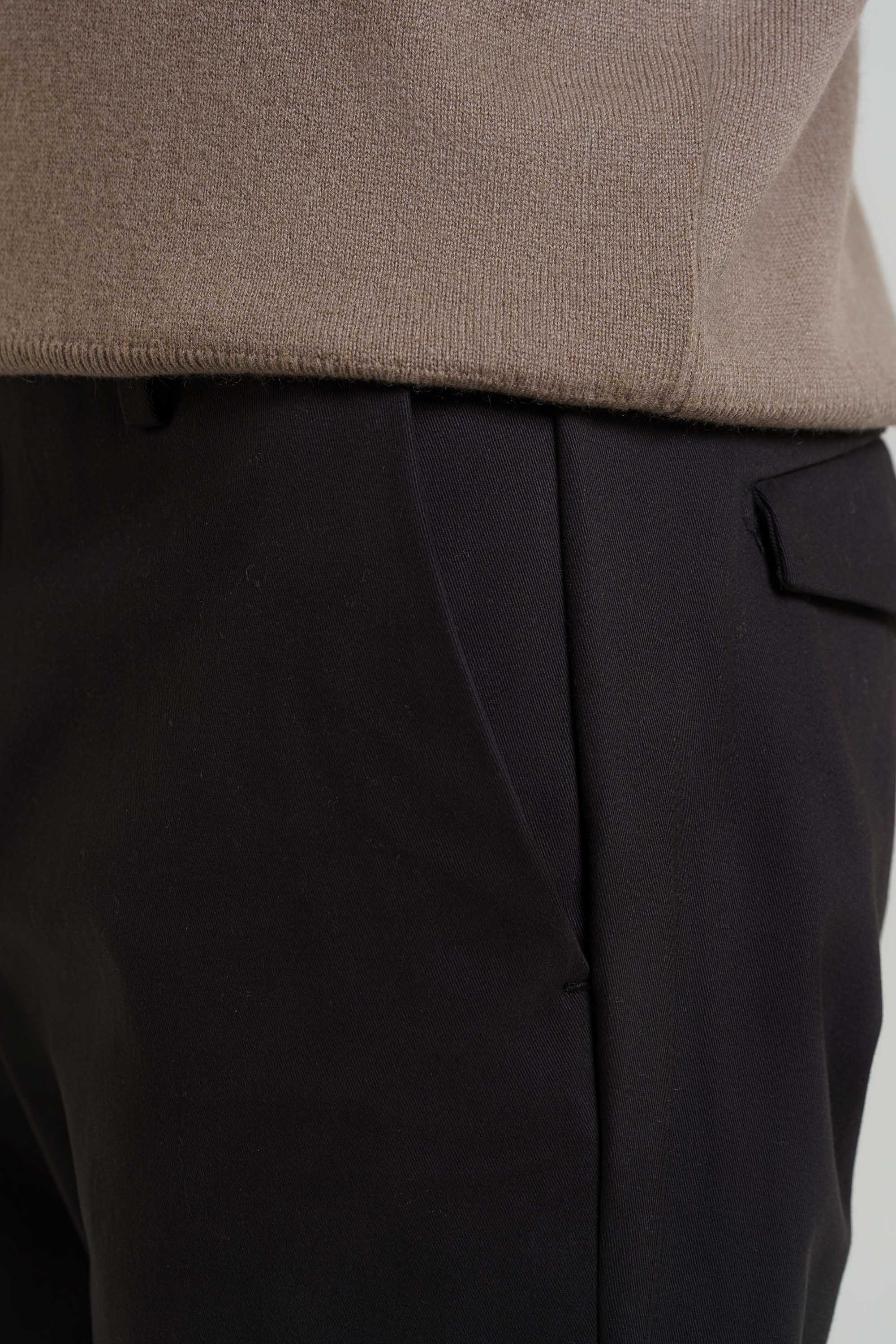 Pantaloni tasca america,ventre piatto in gabardina di cotone tinto pezza.